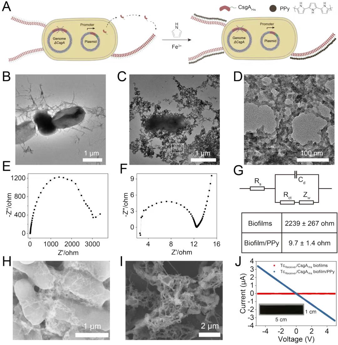 大肠杆菌生物被膜在自然界是不导电的物质,为了实现导电生物被膜的制备。该研究提出了原位聚合聚吡咯(PPy)的方法,进行共形贴附的导电生物被膜制备(图2)。由于固有的界面粘附性,生物被膜可以在基底表面上形成共形贴附的涂层,工程化的生物被膜纤维带有电荷,从而实现了聚吡咯的原位聚合,相互连接的聚吡咯颗粒赋予了生物被膜导电能力。电化学交流阻抗测试和I-V测试证实了通过该方案制备的材料不论在液体环境还是空气环境都具备良好的导电性。这些测试预示着除了光催化外,还可能在电子器件和设备方面有潜在应用。