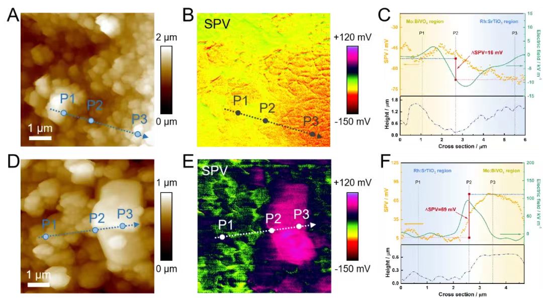 为了理解微观尺度下的电荷分离效果,本项目采用了光辅助的开尔文探针力显微镜(AM-KPFM)对半人工杂化涂层进行了探究(图4)。在光照条件下,[Bi]和[Sr]之间的ΔSPV为69mV,相应的内置电场为95kV m-1,相比非导电生物被膜涂层,电荷分离和迁移都得到了显著增强。共形贴附导电生物被膜可以在微观上增强2种半导体光催化剂的电荷分离和迁移,这一结果也印证了光催化全解水的实验结果。