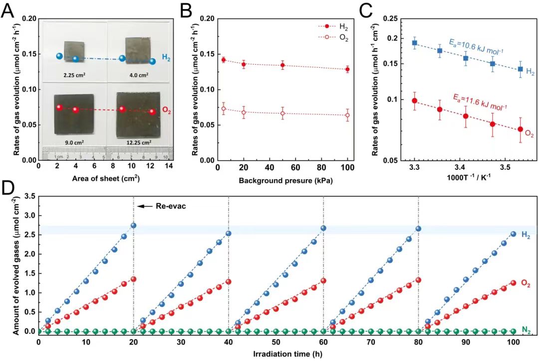 该研究通过在大肠杆菌生物被膜进行聚吡咯的原位聚合,实现了共形贴附的导电生物被膜构建。通过滴涂法实现光催化剂涂层制备,并在其表面原位生长导电生物被膜,就可以实现半人工光合体系的构建,实现光催化全解水,产物中氢气和氧气的比例稳定维持在2:1。该体系拥有100h的长时间运行稳定性以及对于不同背景压力的耐受性,并且具有规模化生产潜力。本研究实现了活体能源材料在可持续清洁能源方面的应用,并且对于生物整合相关的系统设计也有非常好的参考意义。