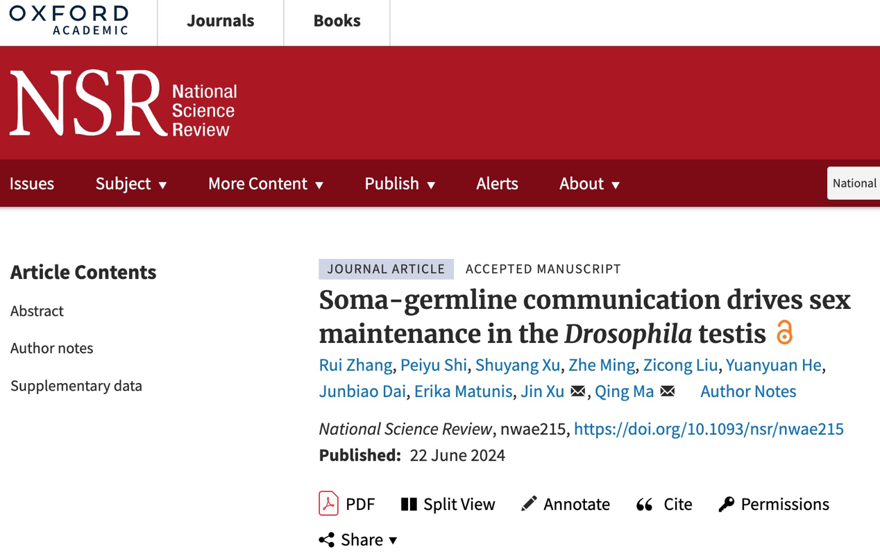 2024年6月22日,中国科学院深圳先进技术研究院合成生物学研究所、深圳合成生物学创新研究院马晴课题组和中山大学生命科学院徐锦课题组在National Science Review杂志在线发表了题为Soma-Germline Communication Drives Sex Maintenance in the Drosophila Testis的最新研究成果。