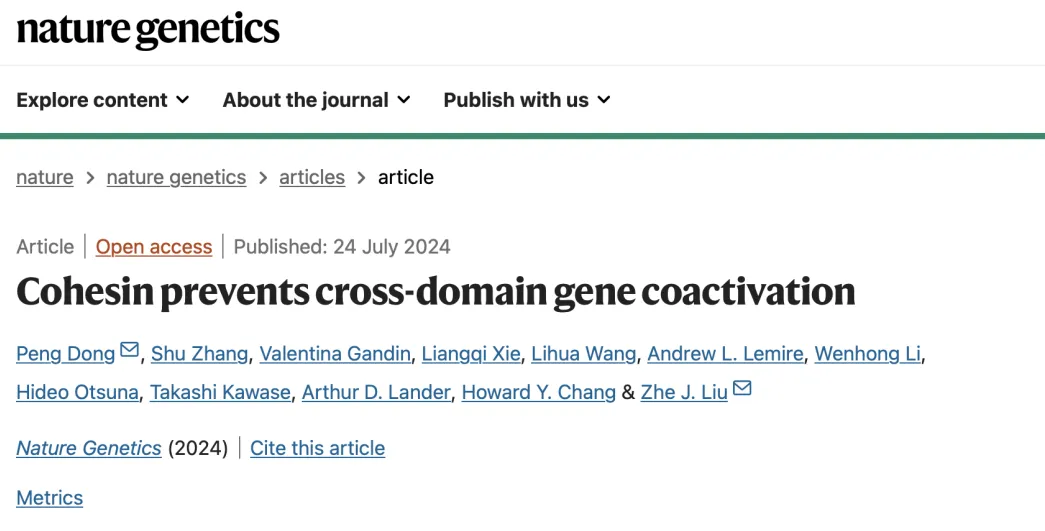 7月24日,中国科学院深圳先进技术研究院生物医学与健康工程研究所生物医学光学与分子影像研究中心董鹏研究员等,与美国霍华德∙休斯医学研究中心/珍利亚研究所 (HHMI/Janelia Research Campus) Zhe Liu等合作,在Nature Genetics上发表了题为 “Cohesin prevents cross-domain gene co-activation”的研究成果。该研究发现了黏连蛋白复合体 (Cohesin complex) 可以通过控制三维基因组的折叠来阻止跨结构域基因共转录,从而揭示了基因组三维结构参与基因转录调控的普遍性作用机制。