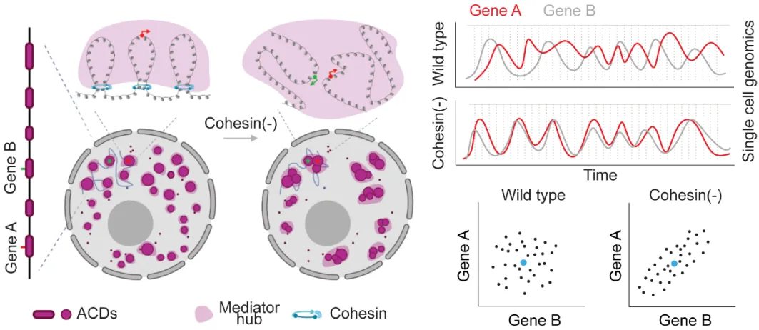该研究通过结合单细胞RNA测序和单细胞染色质可及性测序(ATAC-seq),发现Cohesin复合体的缺失,除了会显著影响基因组的折叠,还会促进不同开放染色质结构域之内基因的共表达(Co-activation)和染色质结构域之间的协同开放(Chromatin co-accessibility)。基于此结果,研究者提出了“基因组三维结构参与基因转录共调控”的科学假设。该研究进一步利用基于内含子顺序杂交(Intron seq-FISH)的空间基因组学方法、单分子定位超高分辨率成像和活细胞单分子示踪等技术,在全基因组和染色体水平上验证了上述科学假设。