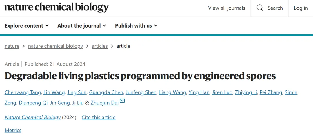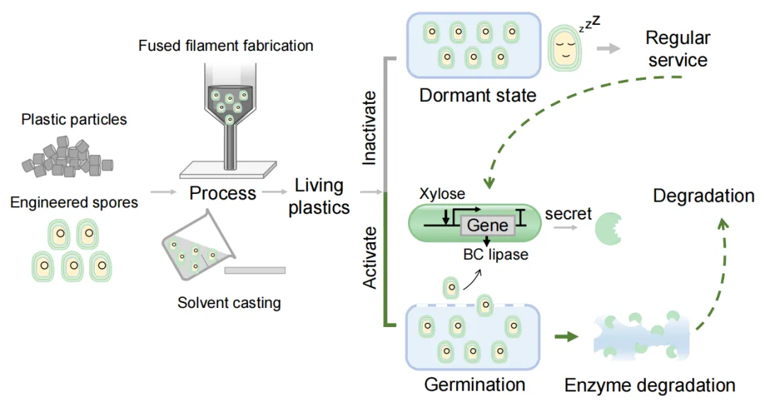 8月21日,中国科学院深圳先进技术研究院戴卓君课题组在Nature子刊Nature Chemical Biology发表题为“Degradable living plastics programmed by engineered spores”的研究工作。该工作通过对微生物进行基因编辑并产生具备极端环境耐受能力的孢子,使其可以在特定条件下分泌塑料降解酶;并通过塑料加工方法(高温、高压或有机溶剂)将孢子包埋在塑料基质中。