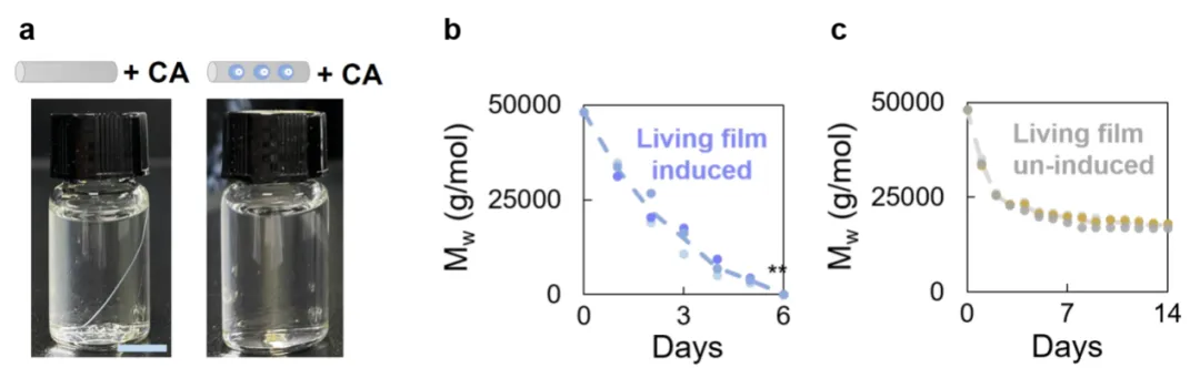 图4. 两种酶对PCL塑料,降解前后的表面结构和分子量变化。(a) CA酶处理普通PCL塑料(左)和活体功能塑料(右)的降解效果;(b)活PCL降解过程中分子量变化曲线;(c) 仅CA酶对普通PCL塑料降解过程中分子量变化曲线