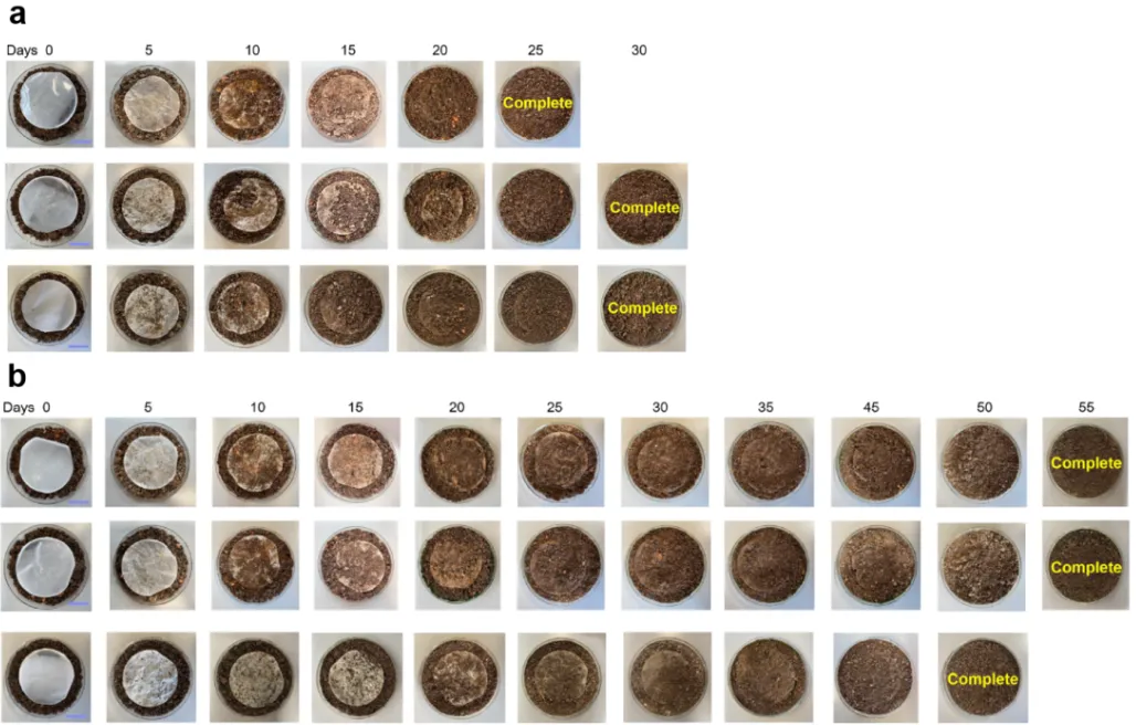 另一种孢子释放的方法是堆肥,在不需要任何其他外源制剂的加入下,土壤环境中活塑料能够在25-30天以内就可被完全降解。而传统PCL塑料则需要55天左右才能被降解至肉眼不可见(图5)。