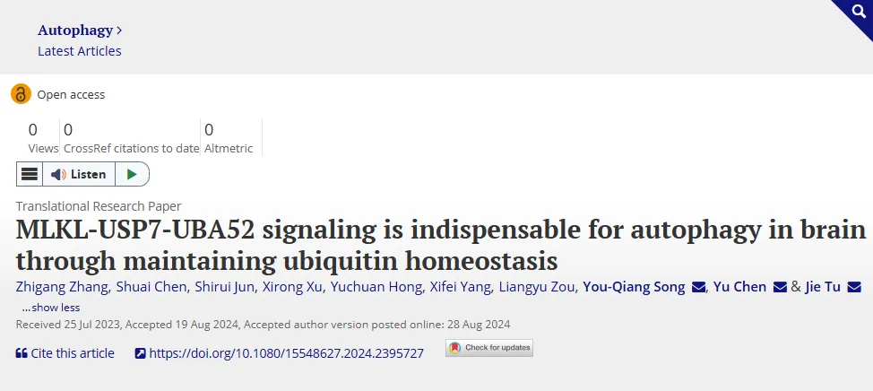 8月28日,中国科学院深圳先进技术研究院脑认知与脑疾病研究所(以下简称“脑所”)/深港脑科学创新研究院屠洁研究员团队在细胞生物学领域的著名期刊Autophagy杂志上发表了题为“MLKL-USP7-UBA52 signaling is indispensable for autophagy in brain through maintaining ubiquitin homeostasis”的研究论文。