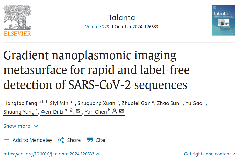 近日,中国科学院深圳先进技术研究院医工所传感中心陈艳研究员团队与香港大学李文迪教授团队,在梯度纳米等离子成像超构表面传感器的生化应用方向取得新进展。相关研究成果以“Gradient nanoplasmonic imaging metasurface for rapid and label-free detection of SARS-CoV-2 sequences”为题,发表在生化领域的高水平期刊《Talanta》 上。深圳先进院冯鸿涛副研究员和香港大学的闵思怡博士为论文共同第一作者,陈艳研究员和李文迪教授为论文的通讯作者。