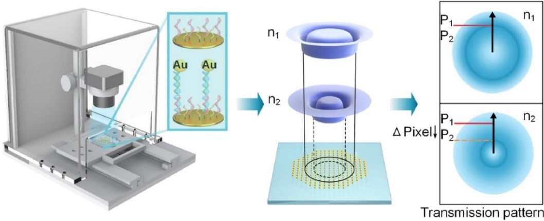 为此,研究团队设计并开发了一种梯度纳米等离子成像(GNI)超构表面传感器,开创性地提出了一种光学势阱的新概念,实现了对SARS-CoV-2序列的无标记和一步式检测。该传感器的核心元件由一系列直径渐变的纳米柱阵列构成,这些纳米柱共同构筑了一个独特的光学势阱,能够在厘米级尺度上生成清晰可见的暗环图案。这一精心设计的动态光学势阱对传感器局部折射率的变化呈现出极高的灵敏度,其图案变化可通过高灵敏度的CCD相机实时捕获并记录。此外,研究团队通过设计精确的核酸探针,成功地在目标序列存在时将纳米金颗粒(AuNPs)锚定在传感器表面。这一纳米金信号增强策略显著提高了传感器对折射率变化的响应,使得原本微量的折射率变动转化为显著的图案变化,从而大大提升了检测的灵敏度,并展示出极高的特异性。