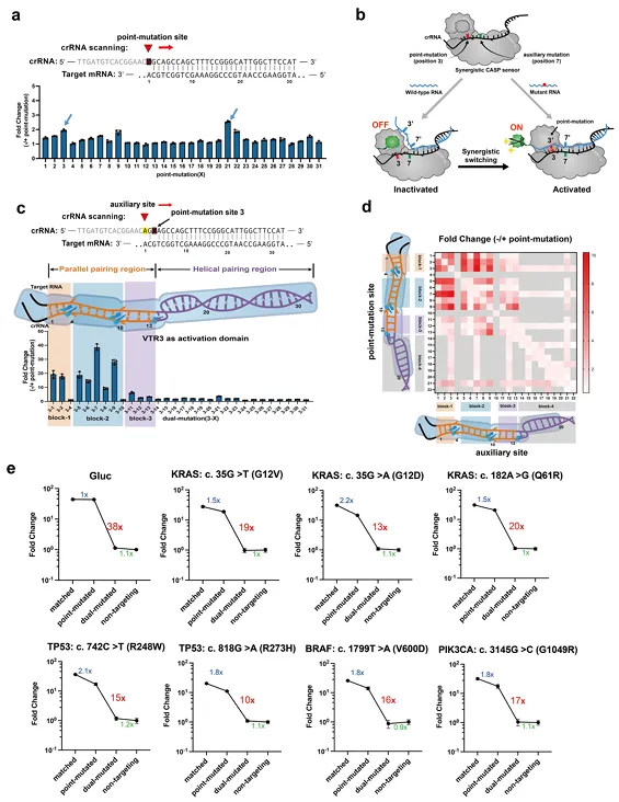 除了RNA的表达异常,基因突变亦是导致癌症、血管、神经性疾病等体细胞病变的重要原因。但野生型与突变型RNA序列之间往往仅有单个核苷酸突变的微小差异,难检测也对RNA-IN模块的感应分辨率提出了更具挑战性的要求。然而,CASP传感器中,RNA感应关键元件“DiCas7-11”对单碱基突变有较高的容忍度,不足以实现单点突变的检测。