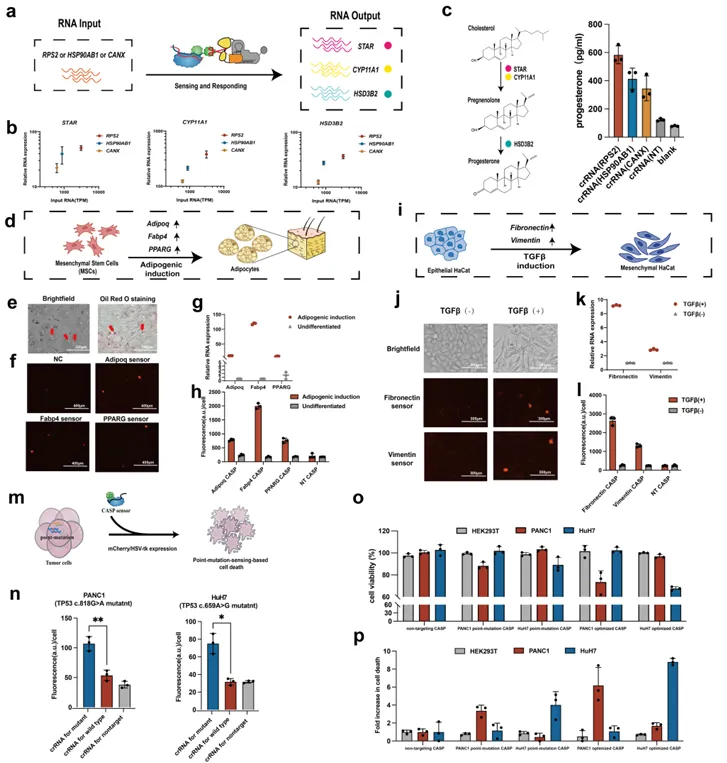 该工作通过在哺乳动物活细胞内构建具有感应及响应功能的RNA-IN/RNA-OUT基因线路,实现任意内源RNA调控网络的重构;且具备活细胞内RNA序列点突变的感知能力,首次将单点突变感知能力由1.5倍提升至94倍;在干细胞分化状态感知、细胞内源性孕激素合成代谢途径激活和肿瘤细胞点突变识别和选择性消杀等多种细胞治疗与基因治疗场景中展示出了广泛的应用潜力,为细胞命运的精准操控提供了全新的工具箱。
