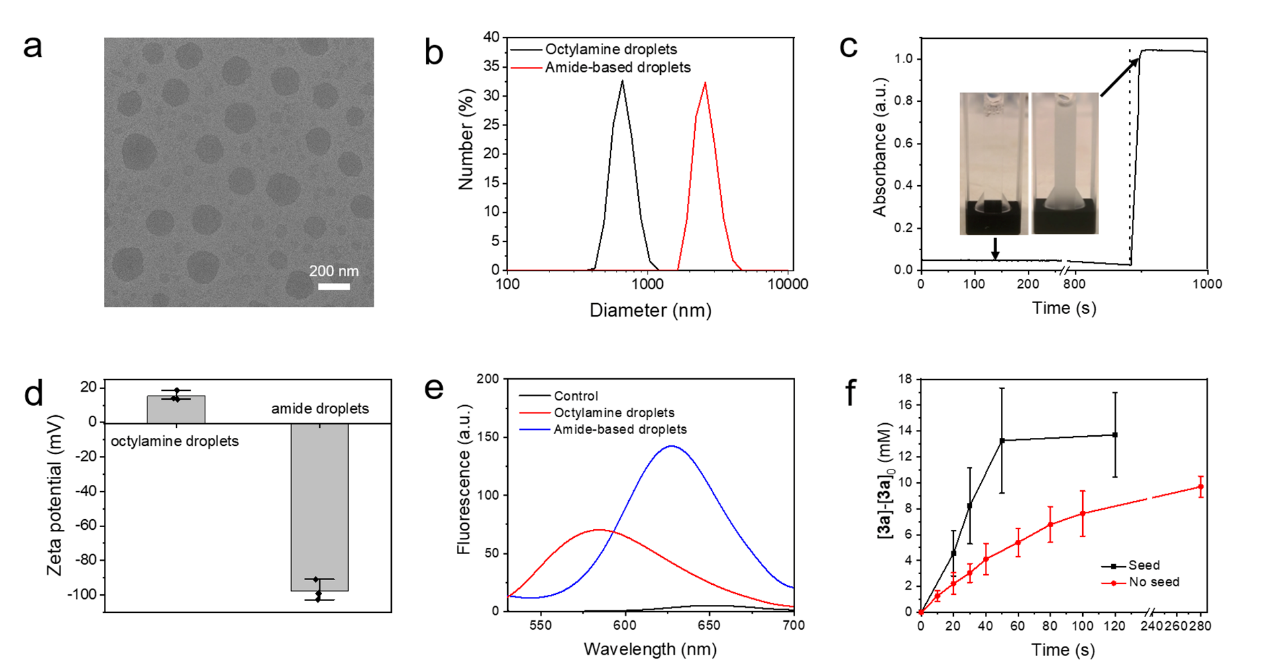 首先开发了一种耗散酰胺键,并构筑了活性液滴。马来酸酐和辛胺在水溶液中反应得到一种酰胺化合物,其在酸性条件下易于水解。碳二亚胺可作为第二种燃料分子,驱动二酸废料与辛胺重新生成酰胺化合物,从而构建耗散反应网络。在这一过程中,酰胺产物能够通过分子间的静电和疏水作用与辛胺组装形成凝聚体液滴。这些液滴中的疏水区域有助于溶解马来酸酐,进而加速反应,实现自催化的生长。