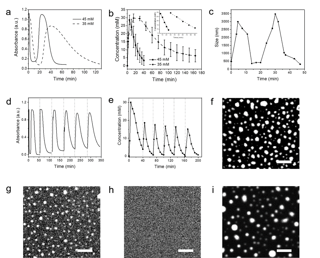通过控制化学燃料的添加,可以实现对液滴生长的动态调控。一方面,化学燃料能触发反应-组装网络中酰胺化合物与辛胺的浓度拮抗效应,促进液滴的震荡式生长;另一方面,当液滴完全水解消失后,加入化学燃料能够使其再生,这一循环可以重复多次,展现出瞬态结构的特征。
