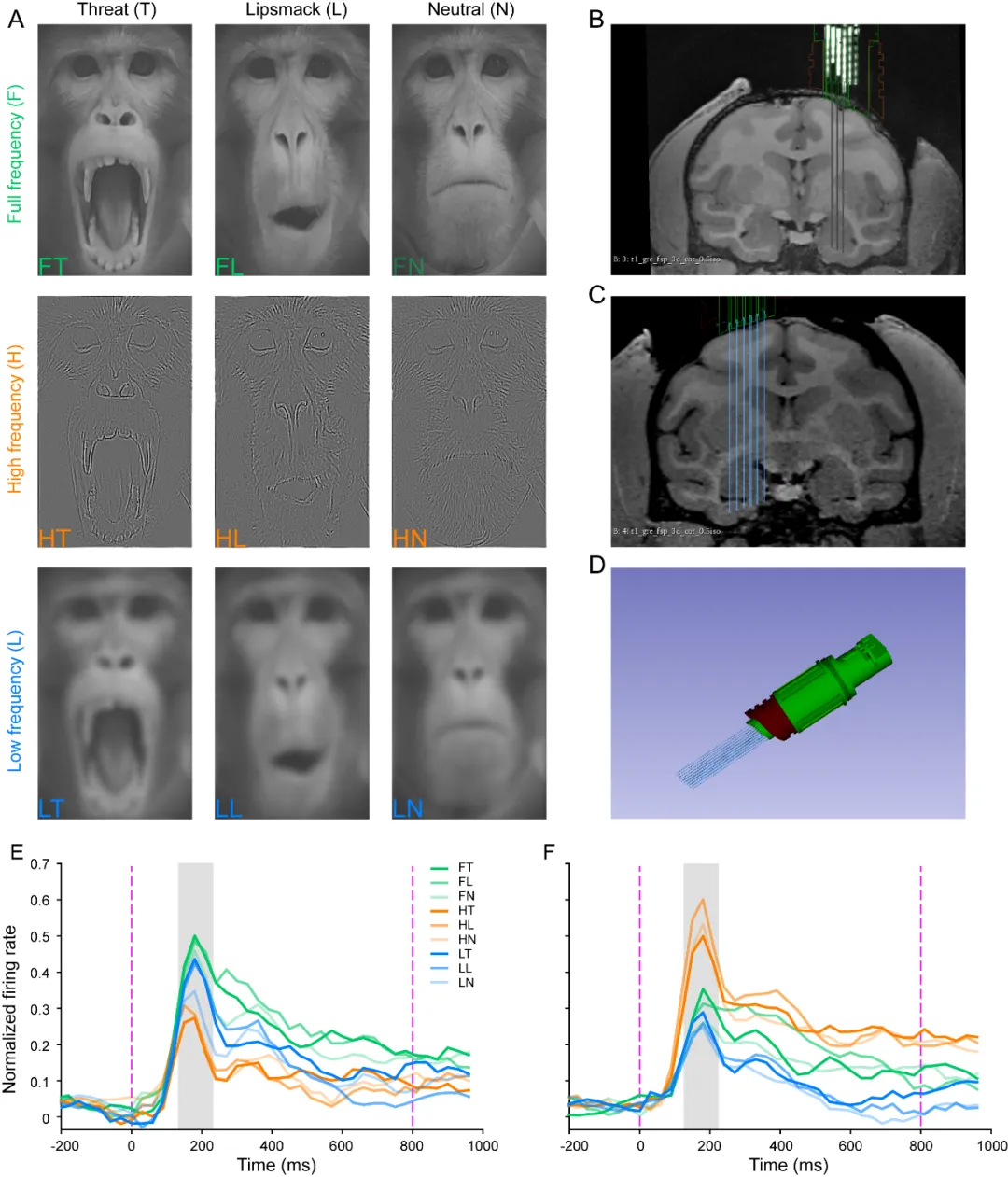 低空间频率(LSF)主要涉及面部情感的整体特征,而高空间频率(HSF)则关注细节和变化。该研究进一步通过fMRI发现,LSF的情感识别与杏仁核的功能具有遗传关联,而HSF则没有这种关联。这表明LSF和HSF在面部情感识别中具有不同的神经基础,反映了它们在情感处理过程中的功能分工。通过对猕猴杏仁核进行在体的单细胞记录,发现杏仁核存在加工LSF和HSF的不同神经元,进一步证实了LSF和HSF在面部情感感知中的区别(图3)。