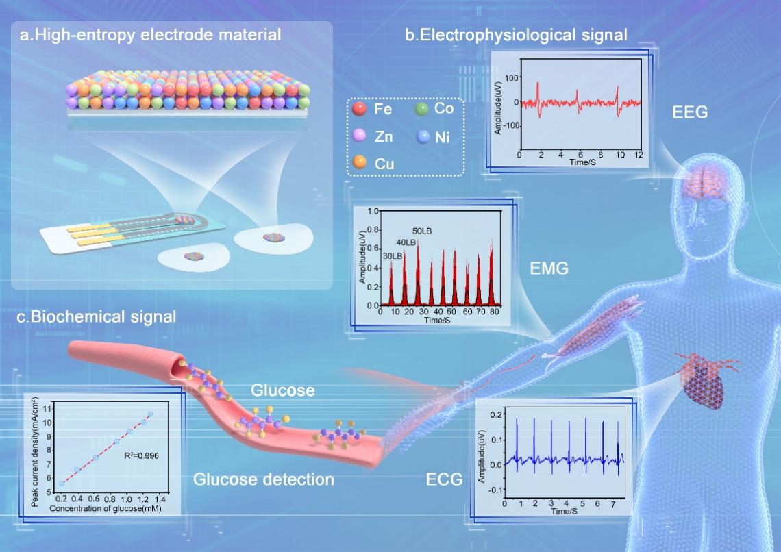 图1:高熵电极材料用于生物电化学和EEG、ECG、EMG生物信号检测的示意图,