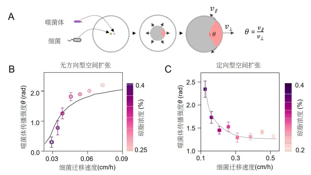 研究发现,当细菌被敲除了趋化基因后,只能依靠自身生长和无序随机运动进行“无方向型空间扩张”,其迁移速度越快,噬菌体传播越广;相反,野生型的细菌拥有趋化基因,能通过化学引导进行“定向型空间扩张”,随着迁移速度的提高,噬菌体的传播范围反而越小(图1)。