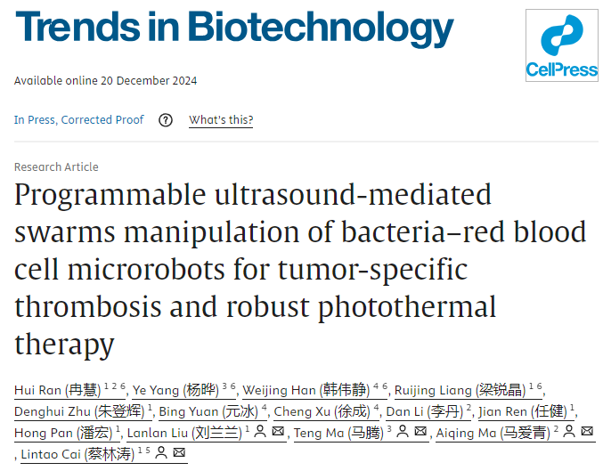 北京时间12月21日,中国科学院深圳先进技术研究院医药所蔡林涛团队和医工所马腾团队联合在国际学术期刊《Trends in Biotechnology》上发表了题为“Programmable Ultrasound-Mediated Swarms Manipulation of Bacteria-Red Blood Cell Microrobots for Tumor-Specific Thrombosis and Robust Photothermal Therapy”的文章。该工作成功开发了一种具有自主缺氧感知和超声响应功能的细菌-细胞生物机器人,通过缺氧靶向联合超声操控,实现肿瘤深层渗透和生成肿瘤特异性血栓,最终实现高效精准治疗。