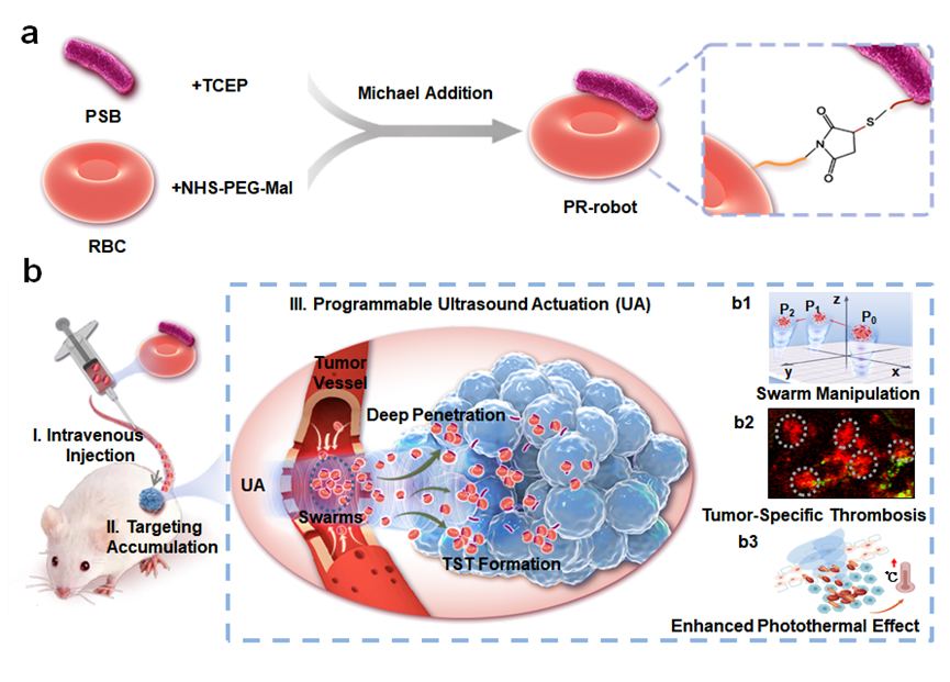 该研究利用光合细菌独特的缺氧感知能力和自身分泌细菌叶绿素的特性,结合红细胞双凹圆盘结构的特点,构建了一种光合细菌-红细胞偶联的生物微型机器人(PR-robot)。该生物机器人具有较长的体内循环时间,并自主靶向肿瘤区域,提高了肿瘤特异性富集效率。同时,红细胞的特殊结构增强了PR-robot的声阻抗,使PR-robot能够以生物集群方式被超声镊精确控制和驱动,甚至穿越生物屏障、深度渗透到肿瘤组织内部。生物群的涌入诱导肿瘤特异性血栓的形成,协同光合细菌增强光热抗肿瘤效果。