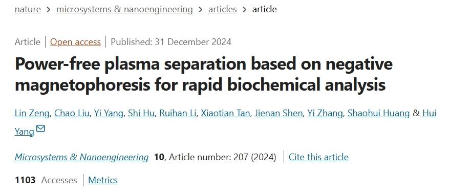 近日,中国科学院深圳先进技术研究院医工所杨慧研究员团队在全血高效分离技术取得了最新研究进展,相关成果以“Power-free plasma separation based on negative magnetophoresis for rapid biochemical analysis”(用于快速生化分析的无源负磁泳血浆分离)为题发表于工程技术领域顶级期刊Microsystems & Nanoengineering(2024,10(1):207)。深圳先进院助理研究员曾霖为论文第一作者,杨慧研究员为通讯作者。
