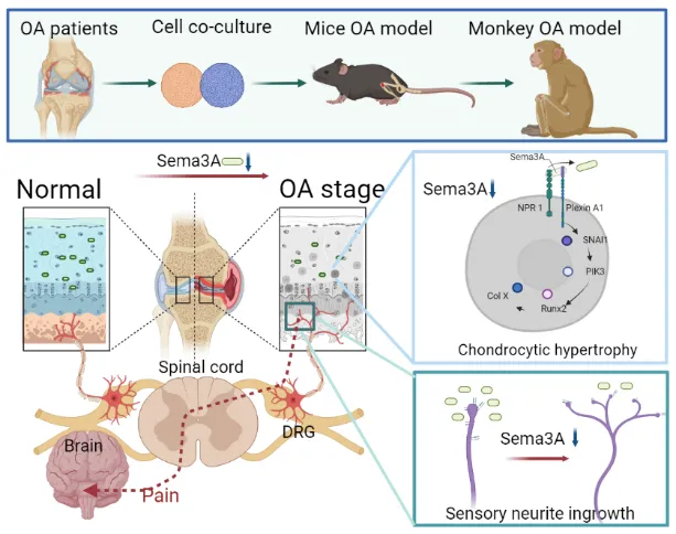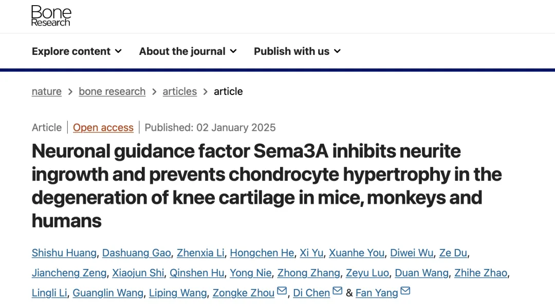 2025年1月2日,中国科学院深圳先进技术研究院脑认知与脑疾病研究所杨帆研究员团队、生物医药与技术研究所陈棣教授团队联合四川大学华西医院周宗科主任团队在这一领域取得重要突破,相关研究“Neuronal guidance factor Sema3A inhibits neurite ingrowth and prevents chondrocyte hypertrophy in the degeneration of knee cartilage in mice,monkeys and humans”发表在Bone Research杂志。