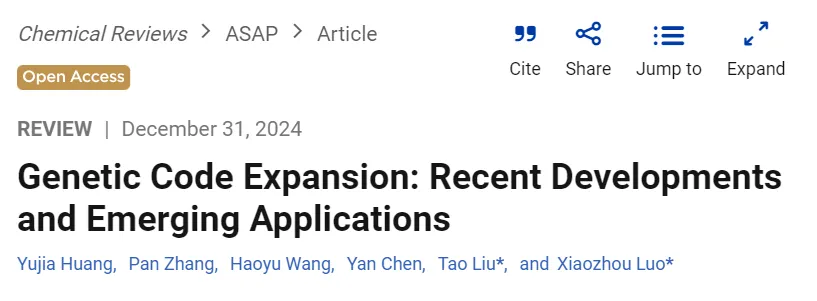 2024年12月31日,中国科学院深圳先进技术研究院合成生物学研究所合成生物化学研究中心(以下简称“深圳先进院合成所生化中心”)罗小舟团队和北京大学药学院刘涛团队在国际著名学术期刊《化学评论》(Chemical Reviews,影响因子51.4)联合在线发表了题为“Genetic code expansion: recent developments and emerging applications” 的综述文章,并被选为期刊封面(图1)。文章从系统层面详细概述了基因密码子扩展技术(GCE)的现状以及面临的挑战与机遇,并重点论述了其在合成生物学、生物机制研究和新型治疗等前沿领域的应用潜力。