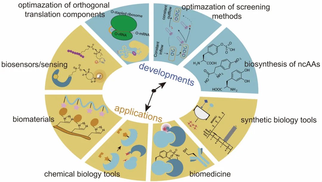 长期以来,DNA和RNA一直被视为存储和传递遗传信息的分子,而蛋白质则是生命活动的主力军。然而,天然蛋白质仅由20种天然氨基酸构成,这一定程度上限制了蛋白质的结构与功能多样性。如今,基因密码子扩展(GCE)技术正在打破这一局限,为生命科学研究带来全新可能。该技术通过引入正交的氨酰-tRNA合成酶(aaRS)/tRNA对,在活细胞甚至完整生物体内的蛋白质翻译过程中,精准地将非天然氨基酸(ncAA)定点引入蛋白质。迄今,已有超过200种功能独特的ncAA成功通过用于GCE技术,其多样的化学基团推动了分子生物学、合成生物学以及生物医学领域的快速发展。GCE技术不仅拓展了蛋白质的化学潜力,也为研究人员探索、操控和开发蛋白质功能,以及创新治疗手段提供了全新的工具。