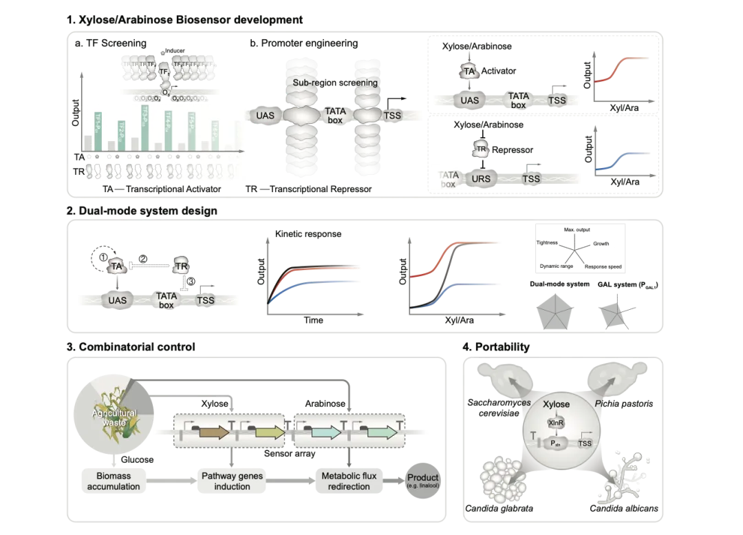 近日,中国科学院深圳先进技术研究院陈业团队于国际期刊Metabolic Engineering发表研究论文"Versatile xylose and arabinose genetic switches development for yeasts"。该研究利用来自曲霉菌种的转录激活因子XlnR和AraRA以及细菌转录阻遏因子XylR和AraRR,在酵母中开发了基于廉价诱导剂的高诱导强度,低泄漏的木糖和阿拉伯糖诱导系统。