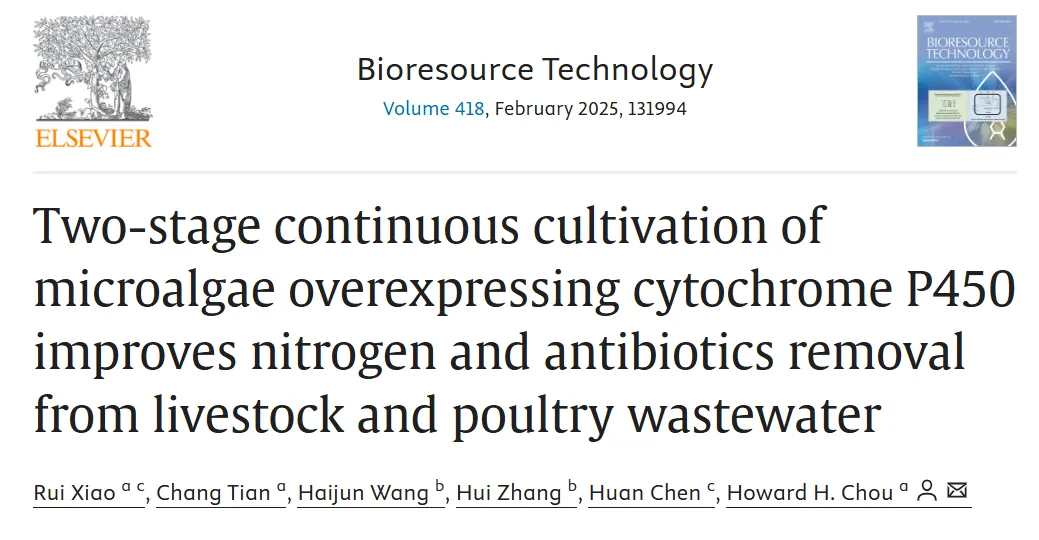 近日,由中国科学院深圳先进技术研究院合成生物学研究所的Howard H. Chou课题组,成都信息工程大学的张辉课题组以及美国克莱姆森大学的陈寰课题组在Bioresource Technology期刊发表重要研究成果"Two-stage continuous cultivation of microalgae overexpressing cytochrome P450 improves nitrogen and antibiotics removal from livestock and poultry wastewater"。