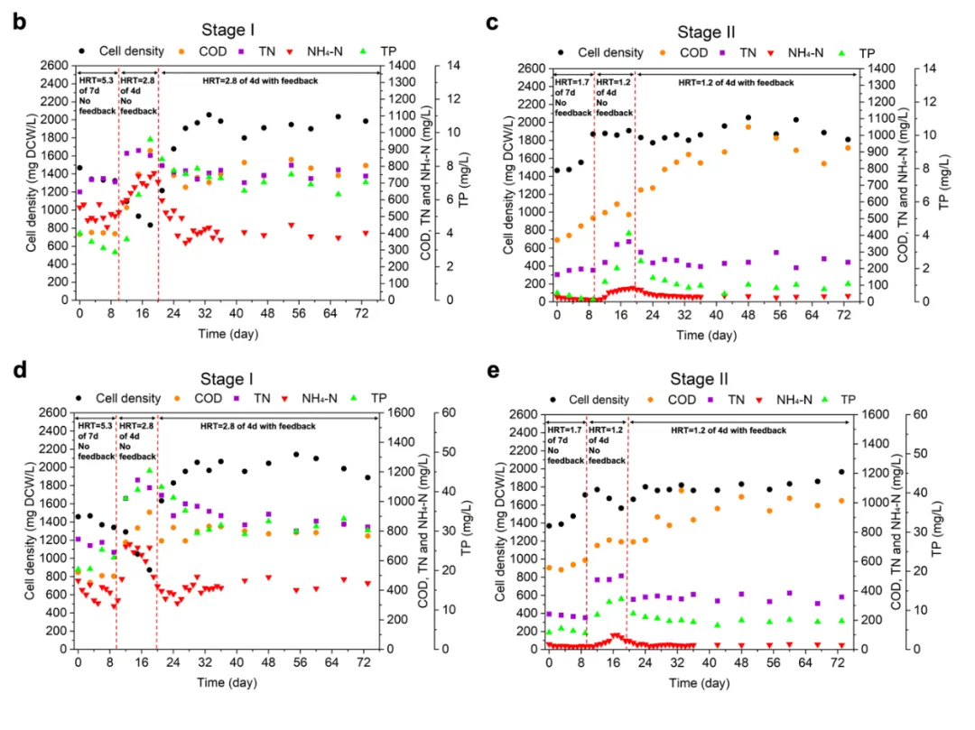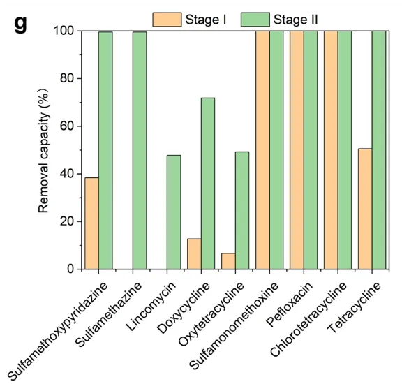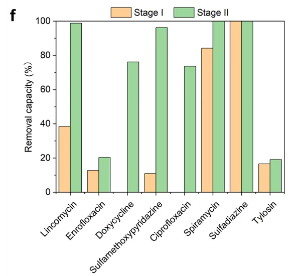 为了能够让 M5 投入商业应用,并且与传统的活性污泥法的水力停留时间相匹配(HRT=4-6天),我们利用了 DBTL 策略来建立了一套新型两级连续反馈式处理系统(CFP)。经过了长达两个月的观察,CFP工艺在水力停留时间为4天的情况下实现了稳定的污染物降解率,其中在鸭场废水中的去除率为 334 mg TN/L/d、306 mg NH4-N/L/d 和 4 mg TP/L/d,在猪场废水中的去除率为 213 mg TN/L/d、213 mg NH4-N/L/d 和 10 mg TP/L/d。即使在将系统总工作体积减少 43% 后,使用CFP工艺的 NH4-N 去除率仍比摇瓶实验高出 70%。另一方面,在对 CFP 系统中抗生素浓度的分析表明,林可霉素、恩诺沙星、磺胺甲氧哒嗪、螺旋霉素、磺胺嘧啶和泰乐菌素的去除效果均有所改善(图 2f、g)。实验数据证实了该套工艺已经可以和传统的活性污泥法的处理效率不相上下了,甚至在总氮的处理方面比污泥法更胜一筹。