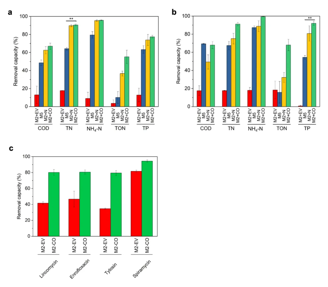 图 3. 细胞色素 P450 对畜牧业废水的解毒测试。通过 M2 与空载体对照(M2+EV)、M5、过表达天然 A23292 的 M2(M2+N)和过表达密码子优化的 A23292 的 M2(M2+CO),去除(a)鸭场和(b)猪场废水中的化学需氧量(COD)、总氮(TN)、铵氮(NH4-N)、总有机氮(TON)和总磷(TP)。(c)在 BG-11 中,通过过表达密码子优化的 A2329 的 M2 抗生素(500 μg/L)去除率