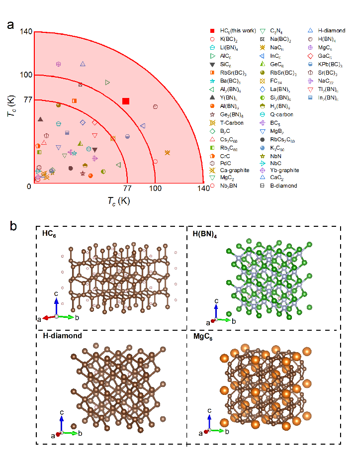 不同于铜基、铁基和镍基超导体等重元素主导的材料体系,本研究中作者基于粒子群优化算法搜索低焓晶体结构,设计得到了一种常压下稳定的新型三维碳结构体系,这是一个全部由轻质元素组成的体系。尽管垂直与晶轴c方向可以观察到石墨烯的结构特征,但是碳-碳原子之间却是形成sp3杂化的三维网格特征。氢原子以孤立原子的形式镶嵌在间隙位置。最终形成的晶体为具有P63/mcm空间群的三维碳结构,化学式为HC6。