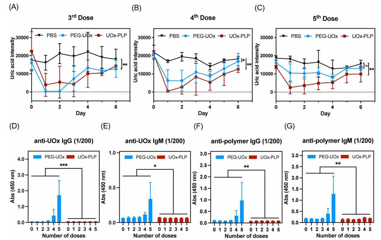 针对高尿酸血症与痛风这一严峻的临床现状,研究团队构建了拟人化高尿酸血症小鼠动物模型进行了五次连续尿酸酶给药实验。实验结果显示,UOx-PLP组小鼠的血尿酸水平在给药后显著降低,并且五次给药后疗效无明显衰减,血尿酸水平仍低于治疗阈值;此外,UOx-PLP在小鼠体内的药代动力学特征稳定,半衰期较长,能够持续发挥降低尿酸的作用。相比之下,PEG-UOx组药物在第三次后即出现明显的疗效下降,且疗效下降与其血液中抗药抗体增加在时间上高度一致。这一实验结果不仅证明了UOx-PLP在治疗高尿酸血症方面的优越性,还为该新型蛋白修饰方法的临床应用提供了有力的支持。