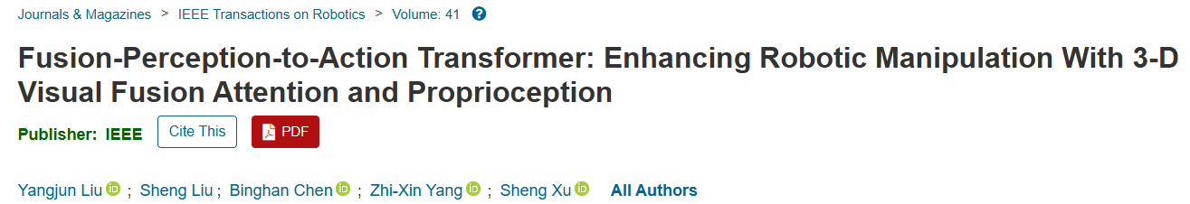 近日,中国科学院深圳先进技术研究院集成所智能仿生研究中心徐升团队与澳门大学杨志新团队合作,在机器人学习领域取得突破,提出了一种基于三维视觉融合注意力机制的端到端多模态模型——Fusion-Perception-to-Action Transformer(FP2AT)。该算法通过融合全局与局部体素网格特征,结合本体感知信息,显著提升了机器人在复杂三维场景中的精细操作能力。研究成果以“Fusion-Perception-to-Action Transformer: Enhancing Robotic Manipulation With 3-D Visual Fusion Attention and Proprioception”为题,发表于机器人领域顶级期刊IEEE Transactions on Robotics,论文第一作者为澳门大学-中国科学院深圳先进技术研究院联合培养博士生刘杨骏,徐升副研究员和杨志新副教授为共同通讯作者,先进院和澳门大学为共同第一单位。