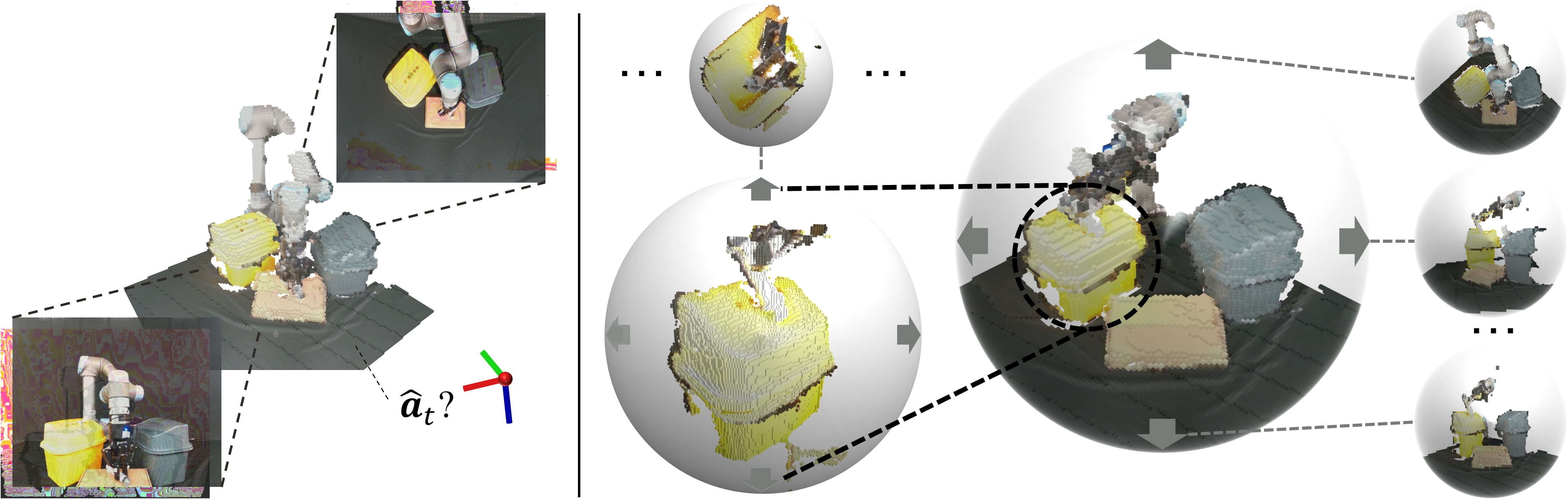传统机器人操作多依赖二维图像观测,难以捕捉三维空间中的物体结构、位置及姿态关系,导致精细化操作任务(如拔插、旋拧、堆叠)成功率低。虽然体素表示(Voxel Grid)能保留丰富的三维空间信息,但现有方法存在特征利用率低、动作预测分辨率不足等问题。人类在完成精细操作时,可通过灵活切换全局视野与局部聚焦,结合手部本体感知动态调整动作。受此启发,研究团队提出了一种“类人”的多模态感知到动作操作框架。