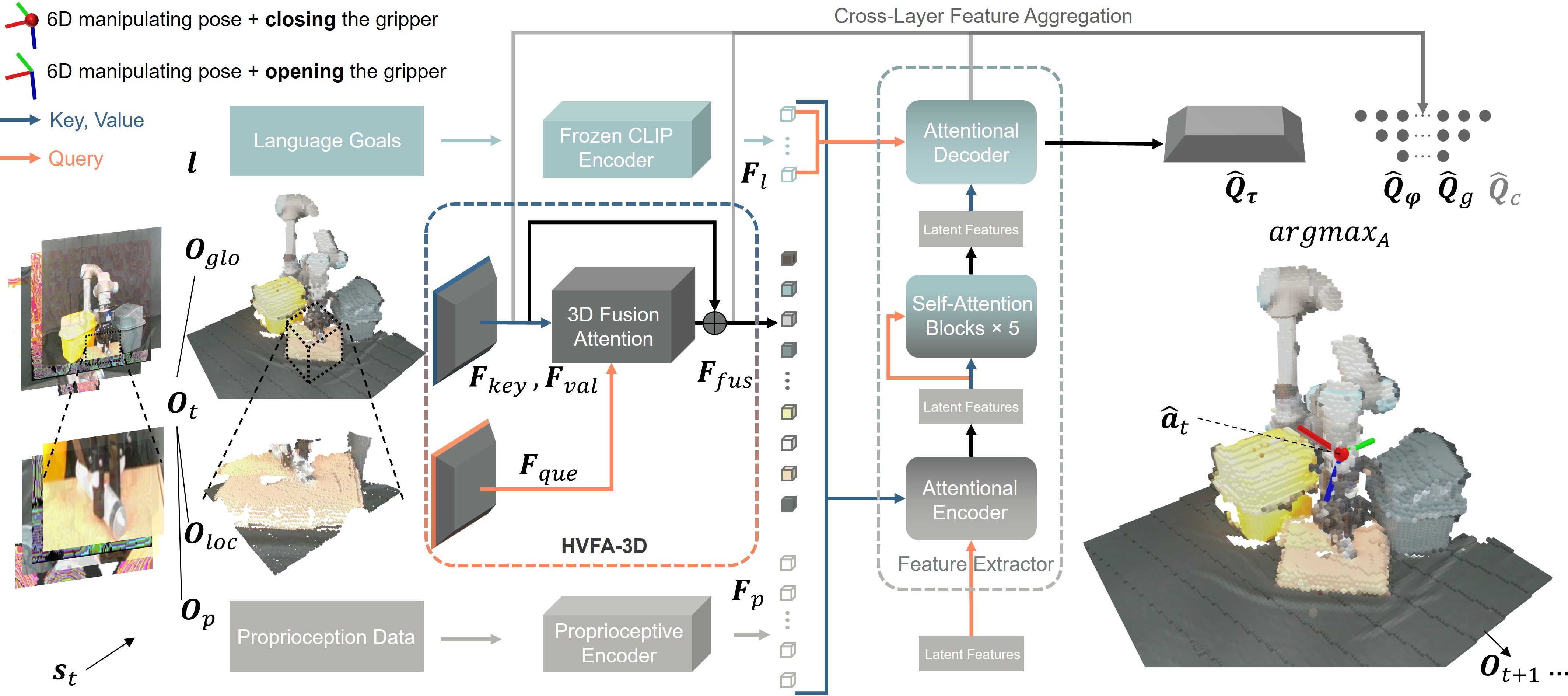 1、设计全局-局部视觉融合注意力(HVFA-3D),模拟人类“先全局观察、再局部聚焦”的视觉感知模式,增强对关键操作区域的关注(图1)。