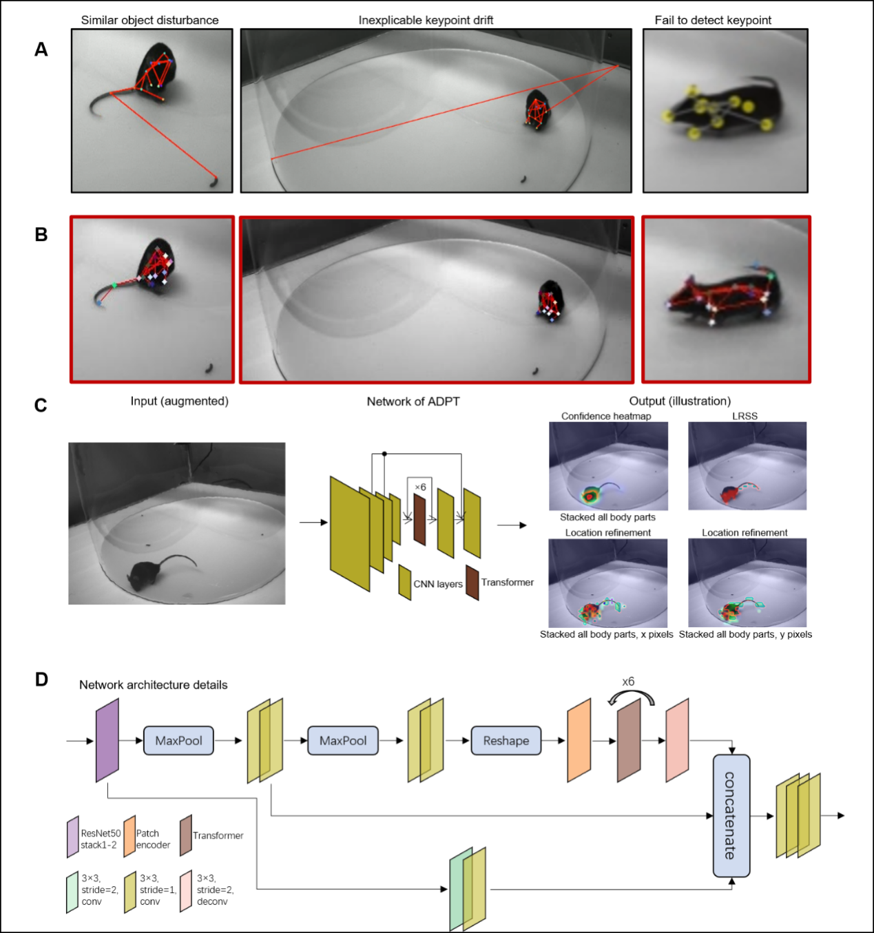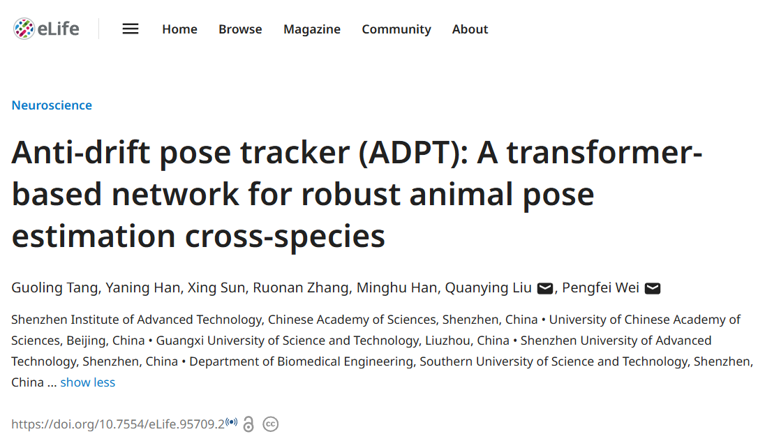 近日,中国科学院深圳先进技术研究院(简称“深圳先进院”)脑认知与脑疾病研究所/深港脑科学创新研究院蔚鹏飞研究员团队在国际学术期刊eLife发表了题为“Anti-drift pose tracker (ADPT):A transformer-based network for robust animal pose estimation across species”的研究论文。研究团队提出了一种基于Transformer架构的抗漂移姿态追踪技术(ADPT),成功实现跨物种动物姿态追踪的高精度、高鲁棒性检测。