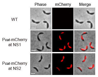 迄今为止,科学家尚未能实现新月柄杆菌中无标记的基因插入。为解决这一难题,研究人员应用CRISPR/SpCas9M-报告系统测试了靶向基因插入的可行性。利用基因敲入进行功能获得性研究时,研究人员选择中性插入位点(Neutral Insertion Site, NIS)以避免基因极性效应。研究人员通过targetFinder鉴定出一组新月柄杆菌潜在中性插入位点,并选取评分最高的NIS位点。当利用CRISPR/SpCas9M-报告系统将Pcat-mcherry敲入到中性位点后,倒置荧光显微镜下可观察到菌株内的mCherry红色荧光信号,证实该基因被正确插入且有效转录翻译。此外,敲入菌株均未检测到明显的生长及形态学改变,表明这些插入位点不会对新月柄杆菌的适应性造成显著影响。
