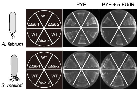 为此,研究人员测试了CRISPR/SpCas9M-报告系统在农杆菌与中华根瘤菌中的编辑能力。实验选择编码胸苷激酶的tdk基因作为靶标,该酶通过将5-氟-2′-脱氧尿苷(5-FUdR)磷酸化为毒性类似物氟-dUMP(F-dUMP),使细胞对5-FUdR敏感。为验证编辑菌株表型,在含200 μg/ml 5-FUdR的PYE平板上进行生长实验。结果显示:Δtdk菌株可在含5-FUdR的平板上存活,而野生型中华根瘤菌与农杆菌则无法生长。