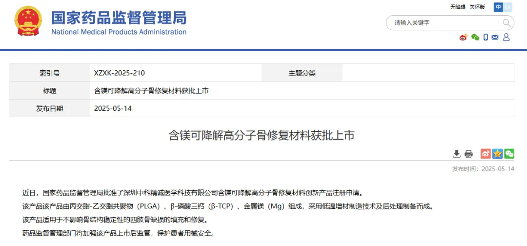 骨缺损修复新方案! | 深圳先进院“含镁可降解高分子骨修复材料”获国家药监局批准上市