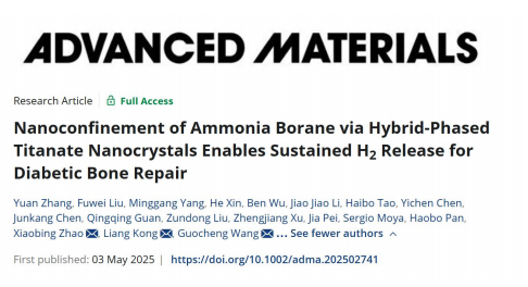 中国科学院深圳先进技术研究院王国成研究员团队联合空军军医大学口腔医院孔亮教授团队、常州大学赵晓兵教授团队,近日在国际学术期刊Advanced Materials发表题为"Nanoconfinement of Ammonia Borane via Hybrid-Phased Titanate Nanocrystals Enables Sustained H2 Release for Diabetic Bone Repair"的研究论文。该研究针对糖尿病患者骨植入失败率高的临床难题,开发了新型纳米限域氢气递送系统。