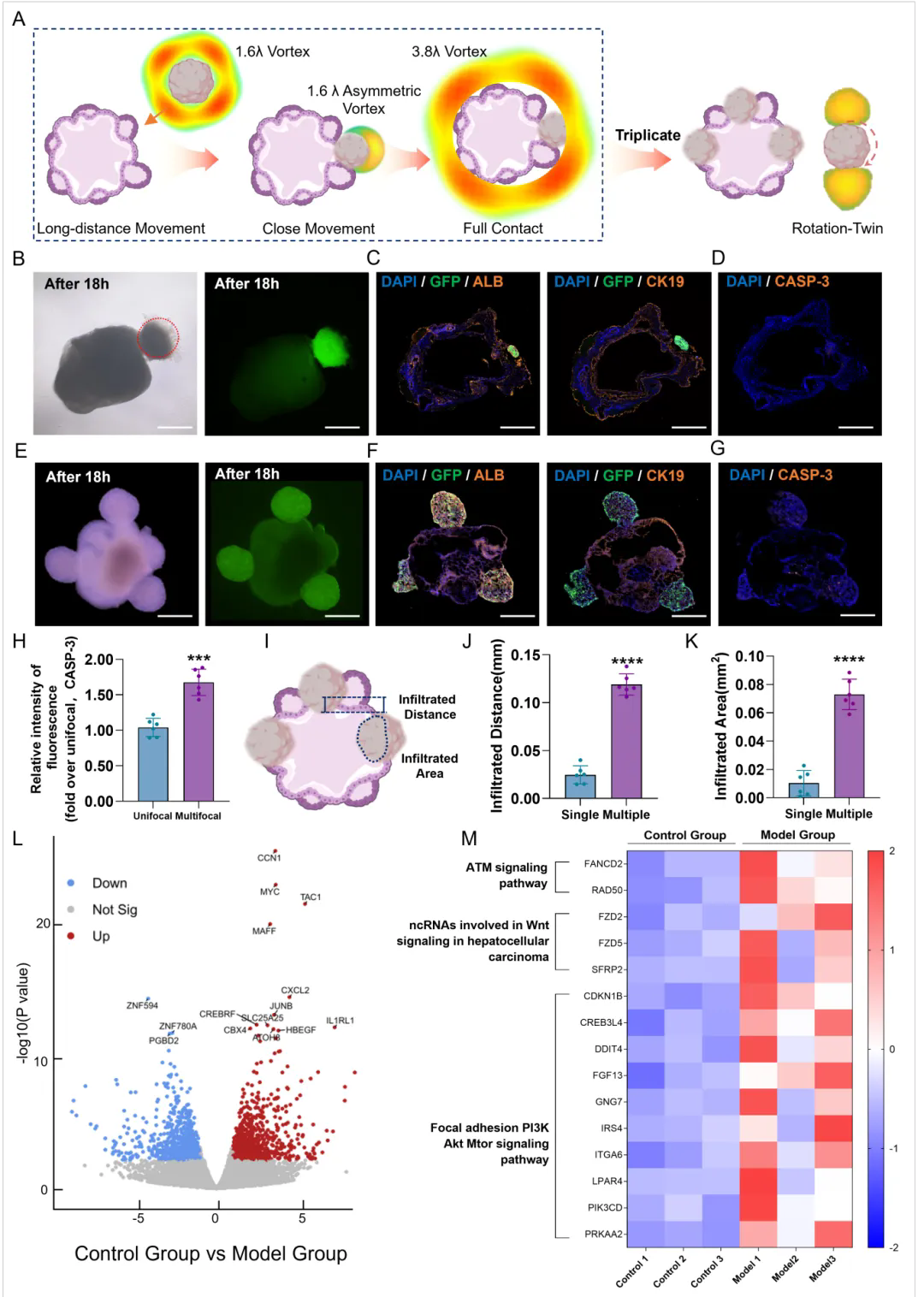 在这项研究中,研究人员以主要聚焦于肝癌转移模型,并开发了一种组织工程技术—全息声镊(Holographic Acoustic Tweezers, HAT),通过个性化构建多重复合声场,实现了对肝癌细胞球的非接触式、精准操控。研究还利用人多功能干细胞(hiPSCs)诱导分化出可以同时表达肝脏和胆管结构功能的肝胆类器官(Hepatobiliary Organoids, HBOs),并利用表达绿色荧光蛋白(GFP)的人肝癌细胞系HuH-7构建肝癌细胞球。同时,通过免疫荧光染色和RNA测序分析,系统评估了不同参数下三维声场对肝胆类器官和细胞球安全性的影响,并进一步优化了操控参数。基于全息声镊和三维细胞培养技术,研究人员进一步开发了“类器官-细胞球在线组装平台”(Organoid-Spheroid Online Assembly Platform, OSOAP),用于构建体外单灶性及多灶性肝癌转移模型,并通过免疫荧光与Bulk RNA测序验证模型的可靠性。实验结果表明,该肝癌转移模型可以可视化肝癌浸润周围肝胆系统的过程,并且可以上调表达肝癌转移过程中特异性的信号通路。