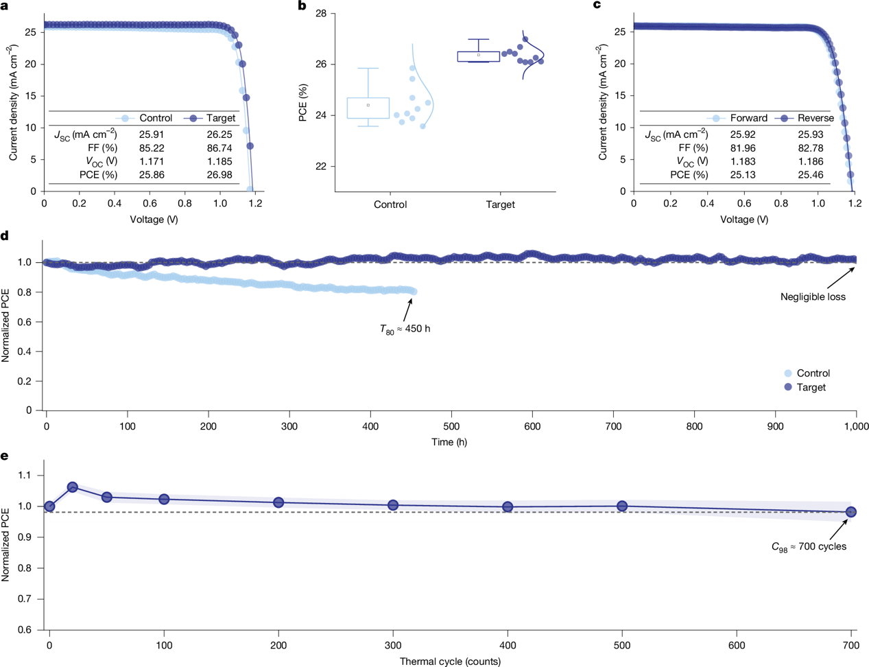 基于该方法制备的反式钙钛矿太阳能电池同时实现了26.9%的认证效率,且连续工作1,000小时后,效率零衰减(基于ISOS-L-2测试标准),并在–40°C至85°C之间经过700次重复热循环后,仍能保持>98%的初始PCE,代表了该领域的顶尖水平(图4)。