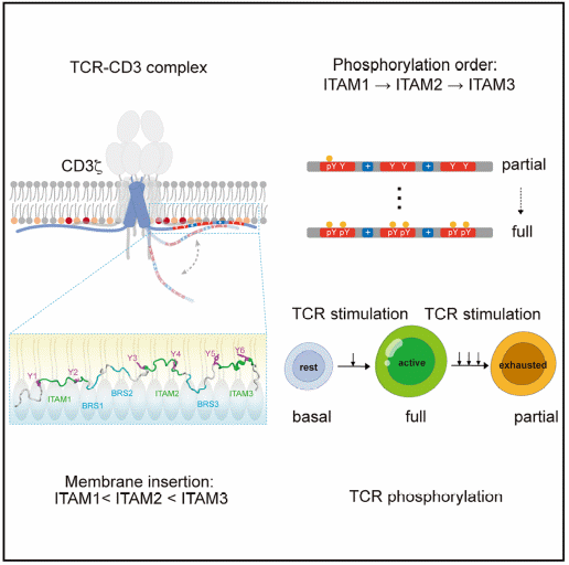综上所述,该研究通过生物物理学、生物化学和免疫学的多学科交叉,解析了CD3ζ胞内区在生理酸性膜环境中的动态结构,阐明了静电调控的ITAM的顺序磷酸化规律,发现了T细胞耗竭的新机制,为免疫治疗提供了新思路。