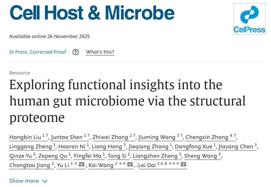2025年11月26日,中国科学院深圳先进技术研究院定量合成生物学全国重点实验室、合成生物学研究所(以下简称“深圳先进院合成所”)戴磊研究员课题组联合北京大学汪锴研究员、香港中文大学李煜教授的合作团队在Cell Host & Microbe发表了题为"Exploring Functional Insights into the Human Gut Microbiome via the Structural Proteome"的研究论文。该研究建立了人体肠道微生物的蛋白质结构组数据库和结构检索方法,显著提高了对噬菌体蛋白、菌源宿主同工酶等功能暗物质的预测能力大幅提高了噬菌体蛋白、菌源宿主同工酶的功能识别能力。基于这一方法,研究团队成功验证了肠道致病菌的噬菌体裂解酶,并首次揭示了肠道细菌的褪黑素合成途径。