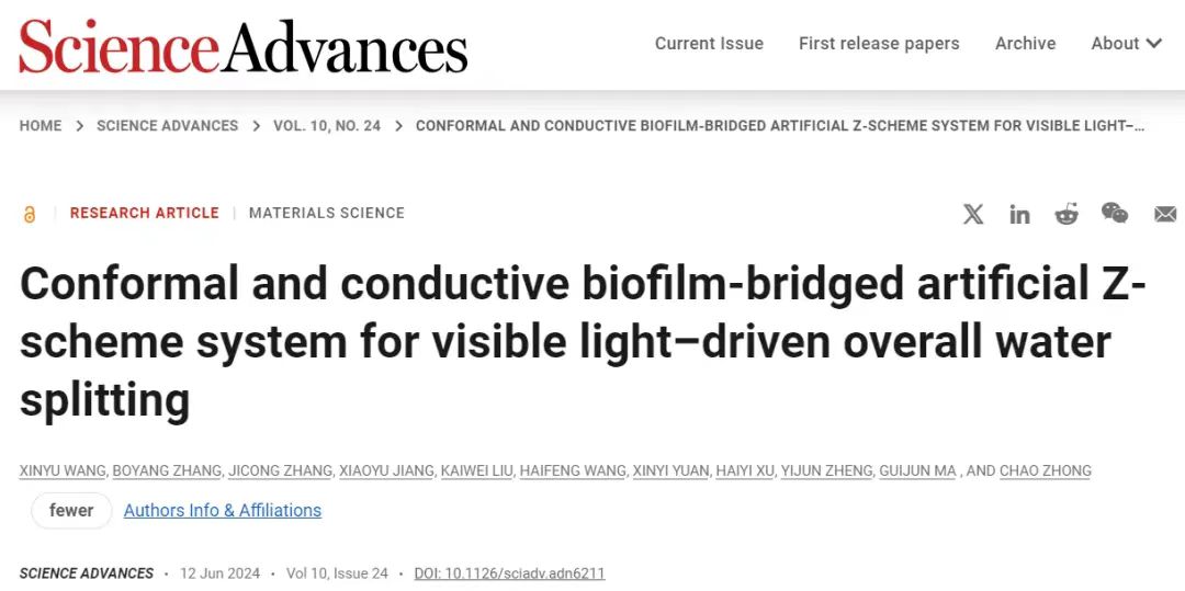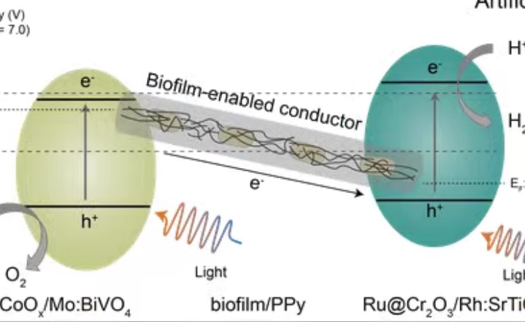 Science Advances | 共形贴附导电微生物生物被膜实现半人工光催化全解水,开发活体能源材料新应用