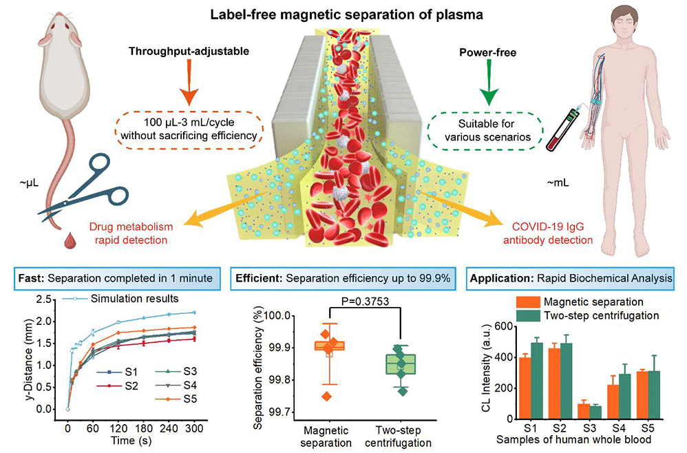 通过离心从全血中提取血浆,是血液检测诊断中的金方法。然而,离心存在显著局限性。当需要快速、高效分离微量血浆时,例如即时检测(POCT)、小动物模型研究等场景中,离心机难以胜任。此外,在荒野环境、急救等场景中,离心机的使用更是不切实际。因此,研究一种能够广泛适用于各种场景...
