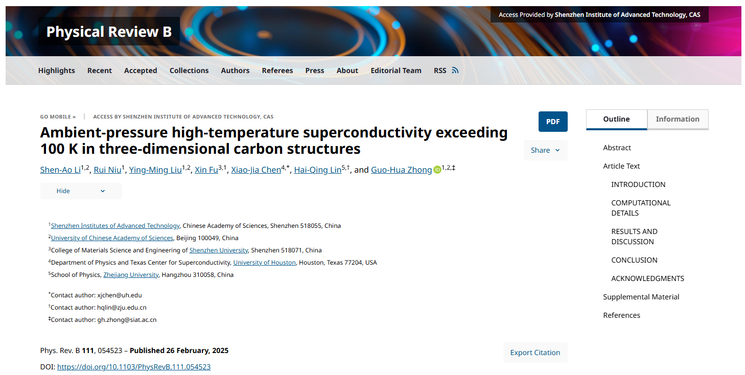Physical Review B | 三维碳结构中被预测存在100 K以上的常压高温超导电性