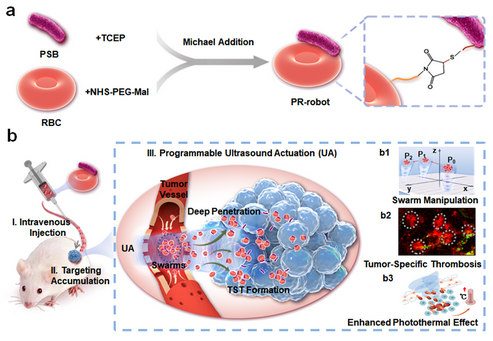 12月21日,蔡林涛团队和马腾团队联合成功开发了一种具有自主缺氧感知和超声响应功能的细菌-细胞生物机器人,通过缺氧靶向联合超声操控,实现肿瘤深层渗透和生成肿瘤特异性血栓,最终实现高效精准治疗。