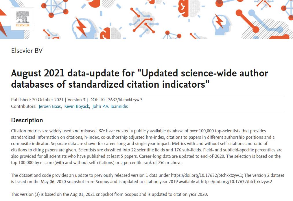 据了解,全球前2%顶尖科学家榜单该榜单数据是Elsevier和斯坦福大学John P. A. Ioannidis教授团队合作的项目成果,发布在Elsevier旗下的Mendeley Data网站上。基于Elsevier Scopus引用数据的系统分析,以被引数、h指数、hm指数等6种关键因素指标进行打分,从全球近700万名科学家中遴选出全球前2%的顶尖科学家,排名分22个领域和176个子学科领域。为科学家长期科研表现的提供了一个衡量指标,能够更客观、更真实地反映科学家的影响力。
