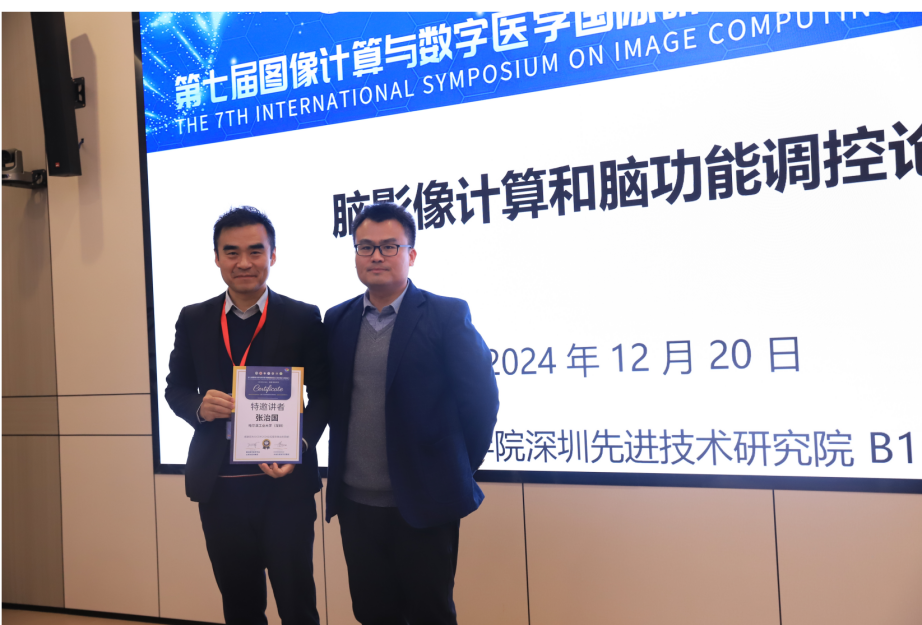 12 月 20 日,由中国科学院深圳先进技术研究院和深圳大学共同承办的第七届图像计算与数字医学国际研讨会(ISICDM 2024) “脑影像计算和脑功能调控” 分论坛在深圳先进技术研究院 B100 会议室举行。数字所所长李烨研究员在论坛伊始发表欢迎致辞,数字所王书强研究员担任论坛主席。